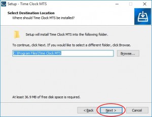 It’s strongly recommended that you leave the destination location as suggested by the installer. Click the Next button to proceed. Note that if you’ve installed Time Clock MTS on your computer before you might get a warning that The Folder c:\Program Files\Time Clock MTS\ already exists. Would you like to install in that folder anyway? If you do, click Yes to continue.
